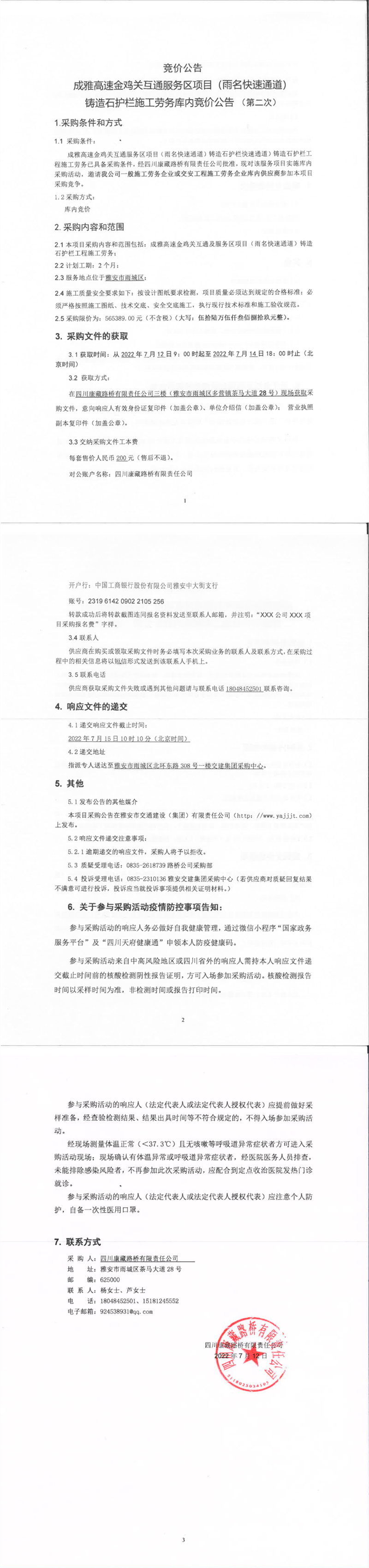 四川康藏路橋有限責任公司成雅高速金雞關互通服務區(qū)項目(雨名快速通道)鑄造石護欄施工勞務庫內(nèi)競價公告(第二次)