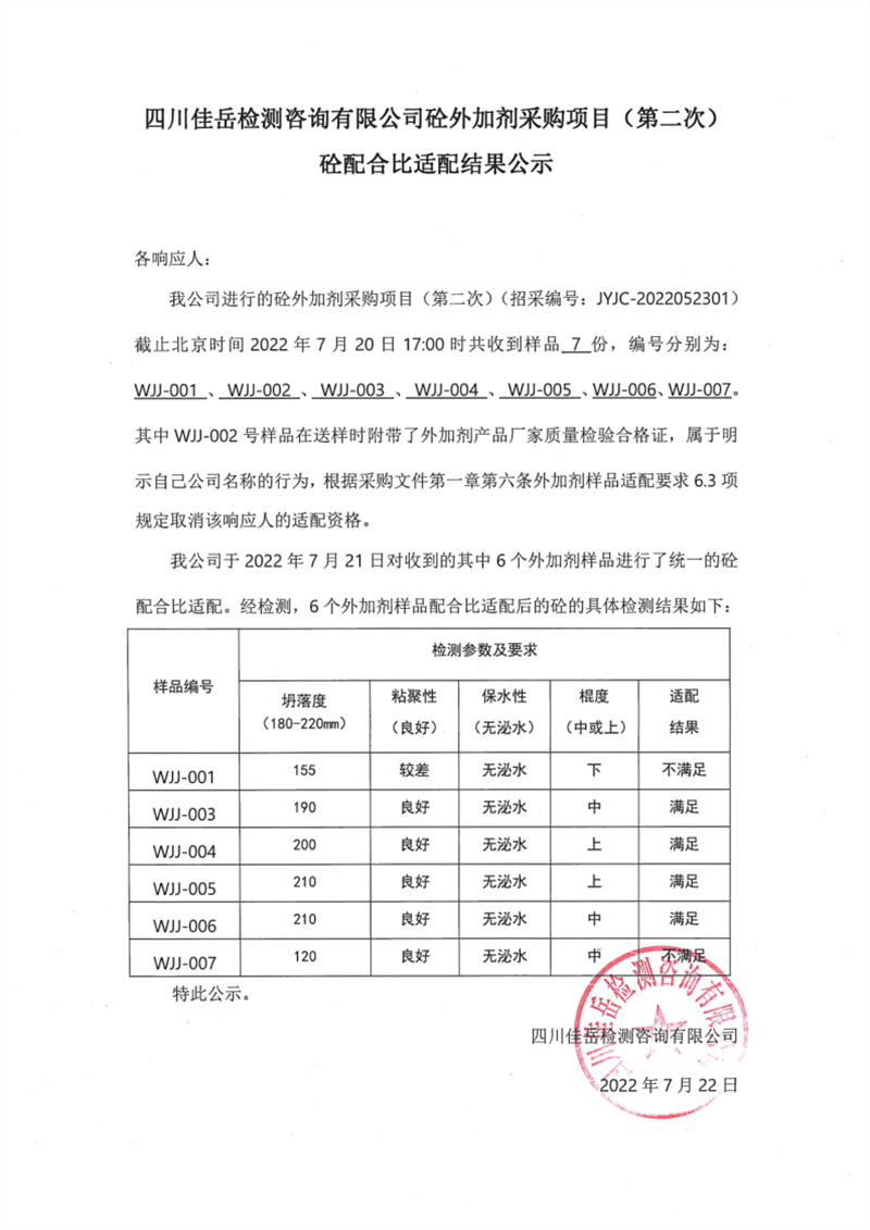 四川佳岳檢測咨詢有限公司砼外加劑采購項目(第二次)砼配合比適配結果公示