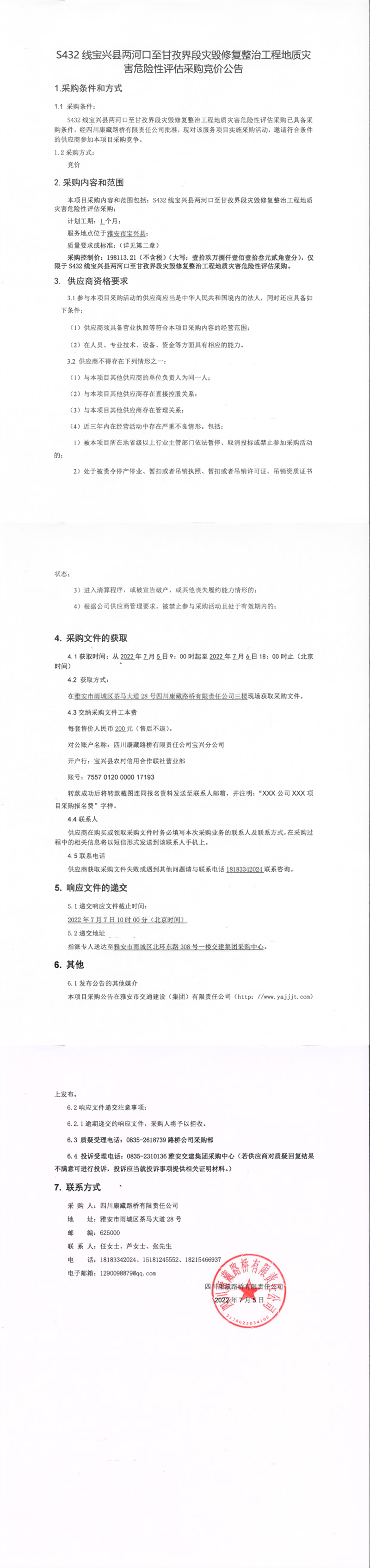 四川康藏路橋有限責任公司S432線寶興縣兩河口至甘孜界段災毀修復整治工程地質(zhì)災害危險性評估采購競價公告
