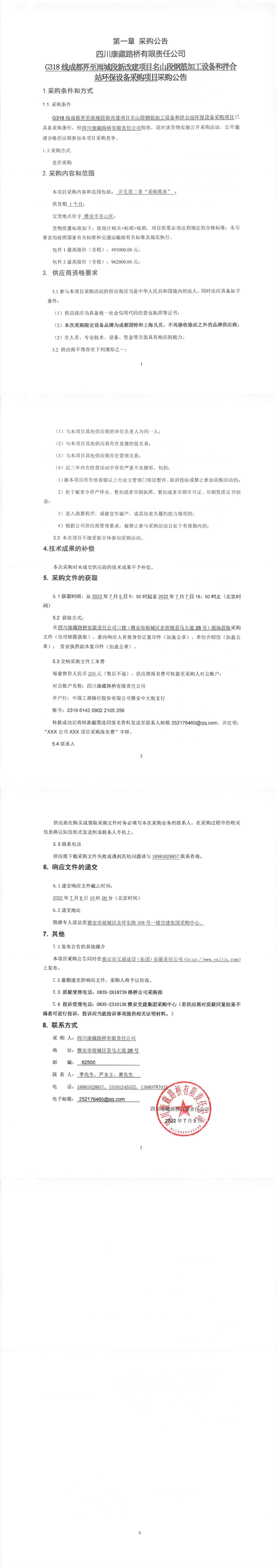 四川康藏路橋有限責任公司G318線成都界至雨城段新改建項目名山段鋼筋加工設(shè)備和拌合站環(huán)保設(shè)備采購項目采購公告