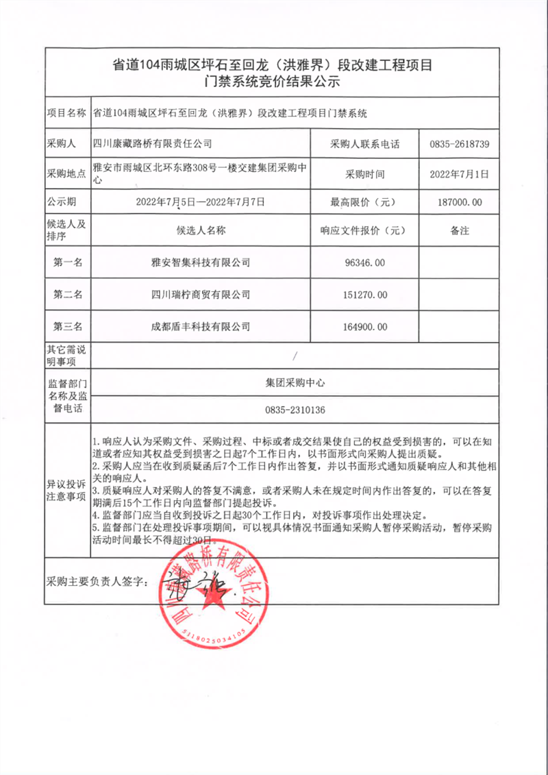 四川康藏路橋有限責(zé)任公司省道104雨城區(qū)坪石至回龍(洪雅界)段改建工程門禁系統(tǒng)競(jìng)價(jià)結(jié)果公示