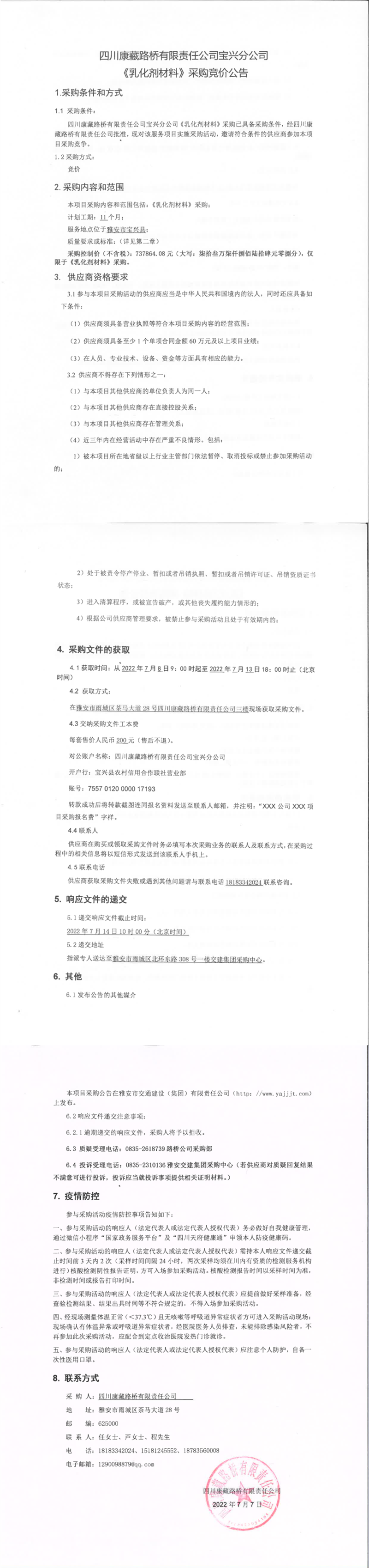 四川康藏路橋有限責(zé)任公司寶興分公司乳化劑材料采購競(jìng)價(jià)公告