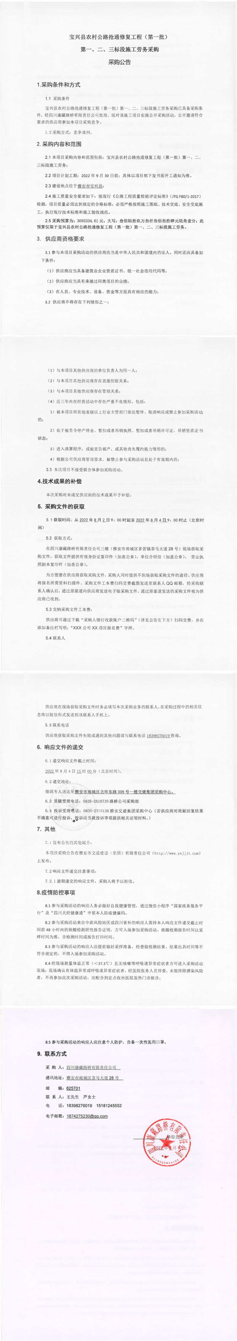 四川康藏路橋有限責任公司寶興縣農村公路搶通修復工程(第一批)第一、二、三標段施工勞務采購采購公告
