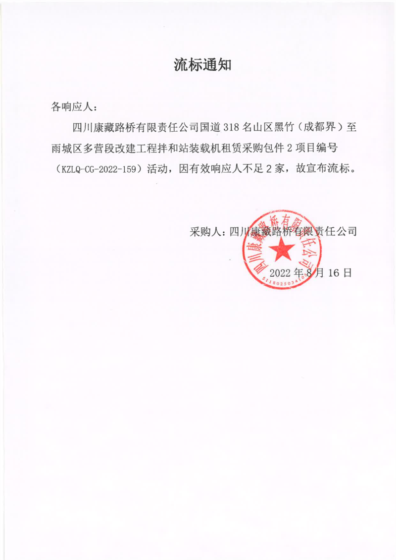 四川康藏路橋有限責任公司國道318名山區(qū)黑竹(成都界)至雨城區(qū)多營段改建工程拌和站裝載機租賃采購包件2項目流標通知