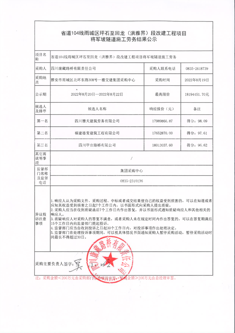 四川康藏路橋有限責任公司省道104線雨城區(qū)坪石至回龍(洪雅界)段改建工程項目將軍坡隧道施工勞務結(jié)果公示