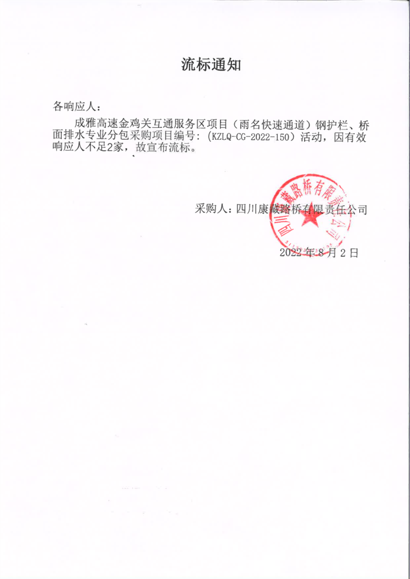 四川康藏路橋有限責(zé)任公司成雅高速金雞關(guān)互通服務(wù)區(qū)項(xiàng)目(雨名快速通道)鋼護(hù)欄、橋面排水專業(yè)分包采購項(xiàng)目流標(biāo)通知
