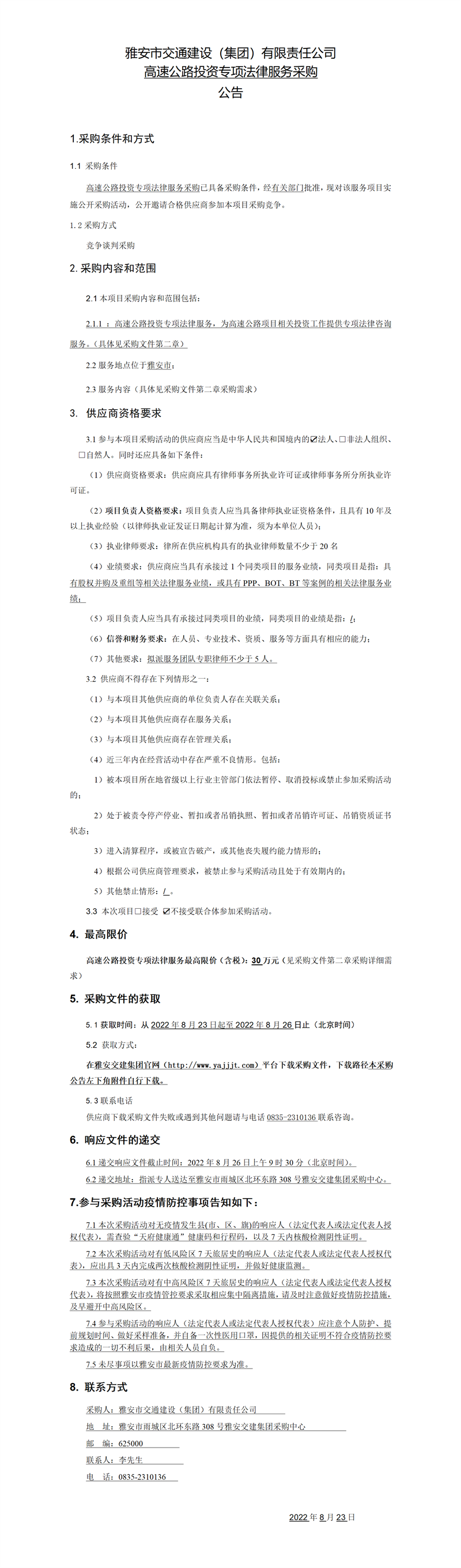 雅安市交通建設(shè)(集團)有限責任公司高速公路投資專項法律服務(wù)采購公告
