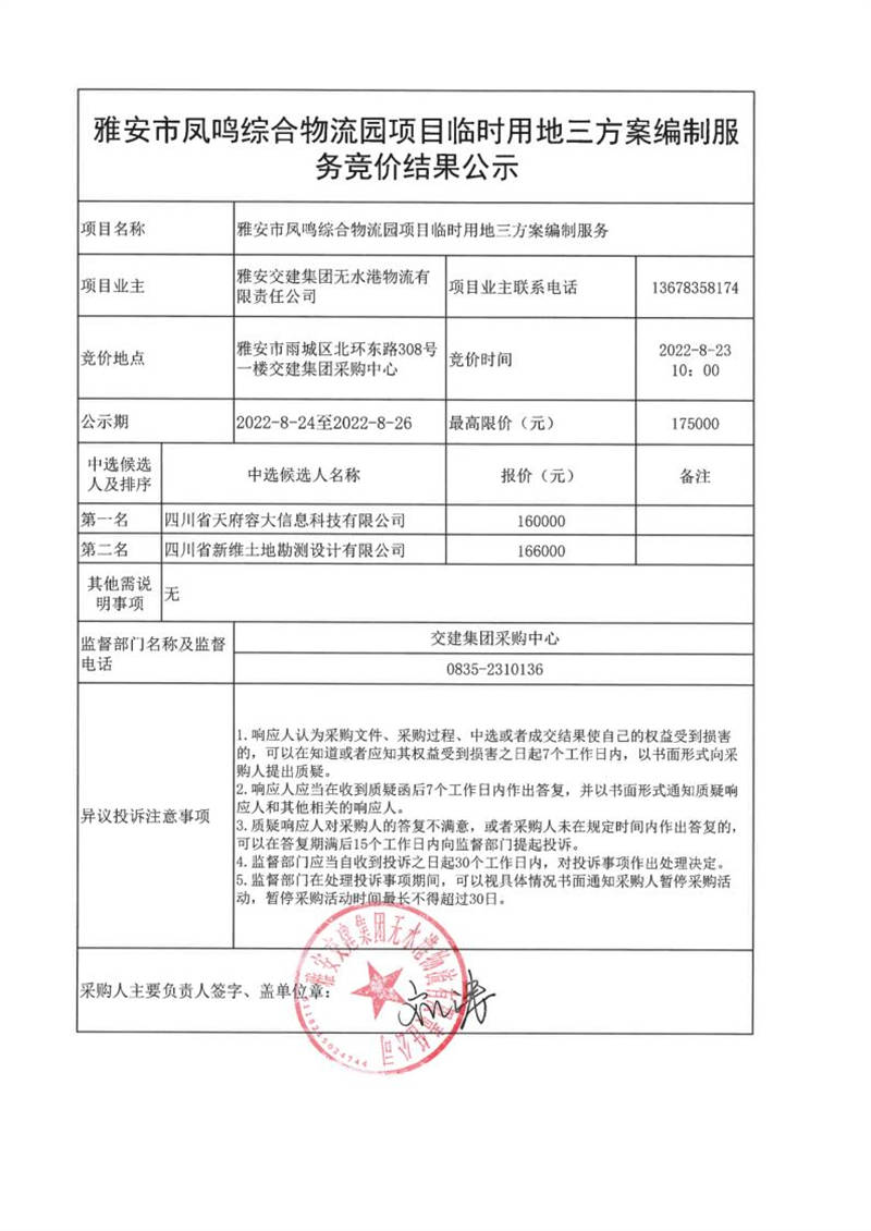 雅安交建集團無水港物流有限責任公司雅安市鳳鳴綜合物流園項目臨時用地三方案編制服務競價結果公示