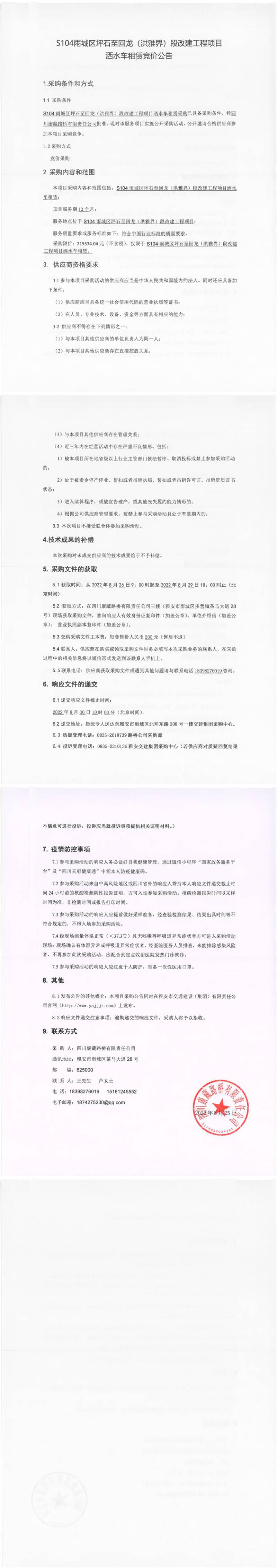 四川康藏路橋有限責(zé)任公司S104雨城區(qū)坪石至回龍(洪雅界)段改建工程項(xiàng)目灑水車(chē)租賃競(jìng)價(jià)公告