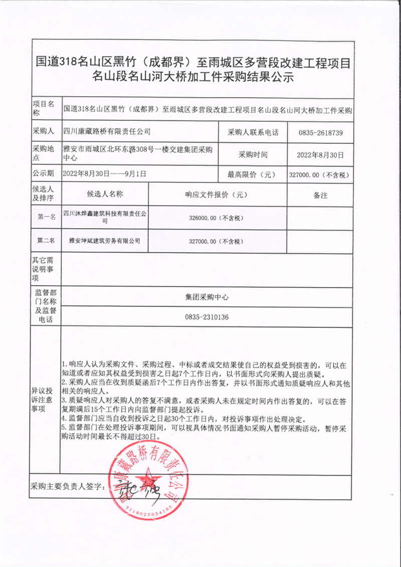 四川康藏路橋有限責任公司國道318名山區(qū)黑竹(成都界)至雨城區(qū)多營段改建工程項目名山段名山河大橋加工件采購結果公示