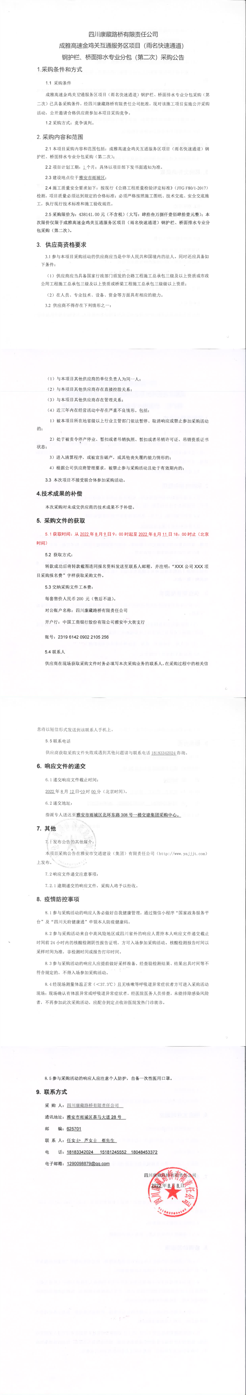 四川康藏路橋有限責(zé)任公司成雅高速金雞關(guān)互通服務(wù)區(qū)項(xiàng)目(雨名快速通道)鋼護(hù)欄、橋面排水工程專(zhuān)業(yè)分包(第二次)采購(gòu)公告