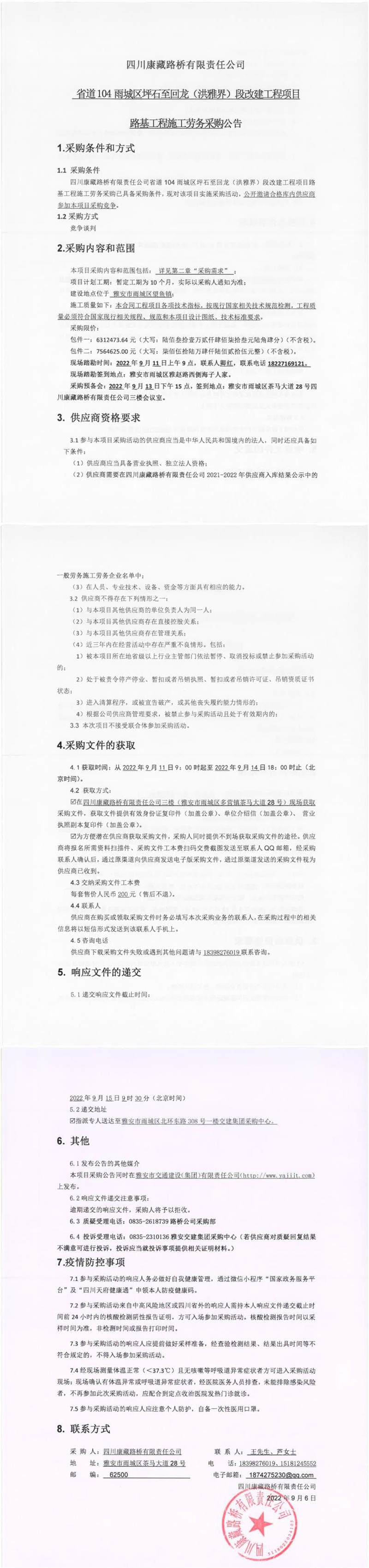 四川康藏路橋有限責(zé)任公司省道104雨城區(qū)坪石至回龍(洪雅界)段改建工程項目路基工程施工勞務(wù)采購公告