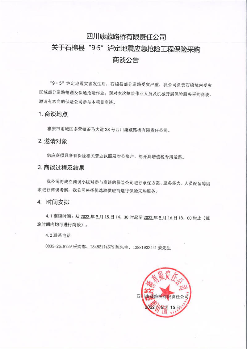 四川康藏路橋有限責任公司關于石棉縣“9·5”瀘定地震應急搶險工程保險采購商談公告