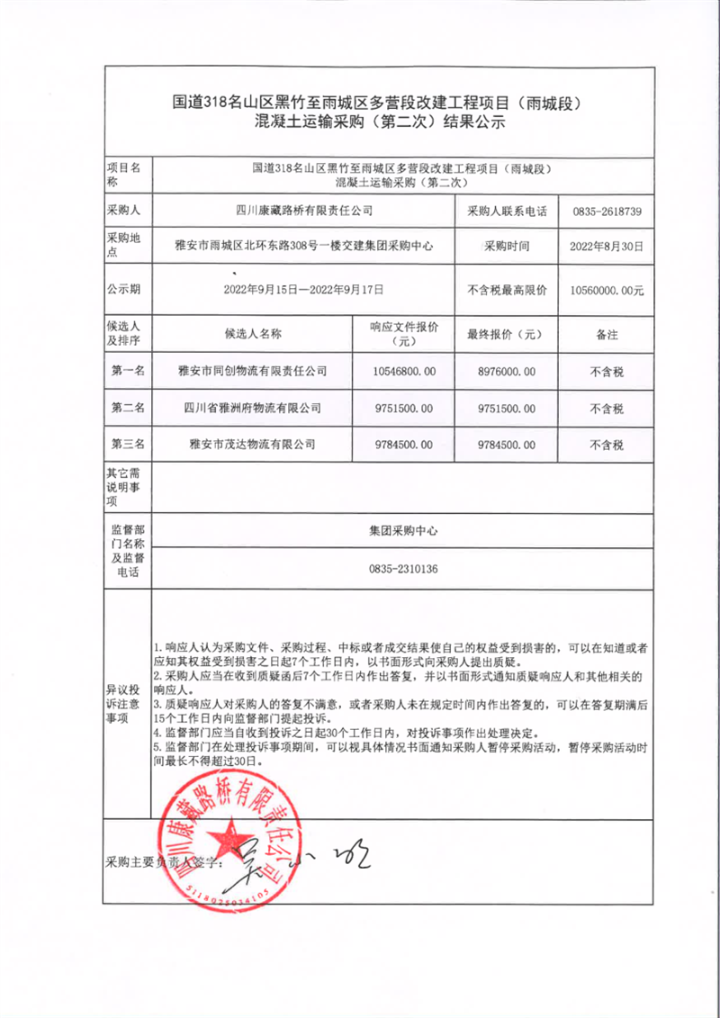 四川康藏路橋有限責任公司國道318名山區(qū)黑竹至雨城區(qū)多營段改建工程項目(雨城段)混凝土運輸采購(第二次)結(jié)果公示