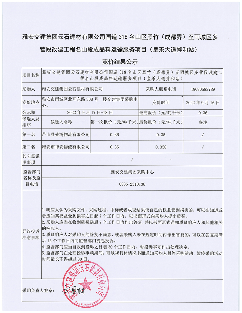 雅安交建集團(tuán)云石建材有限公司國(guó)道318名山區(qū)黑竹(成都界)至雨城區(qū)多營(yíng)段改建工程雨城段成品料運(yùn)輸服務(wù)項(xiàng)目(皇茶大道拌和站)競(jìng)價(jià)結(jié)果公示
