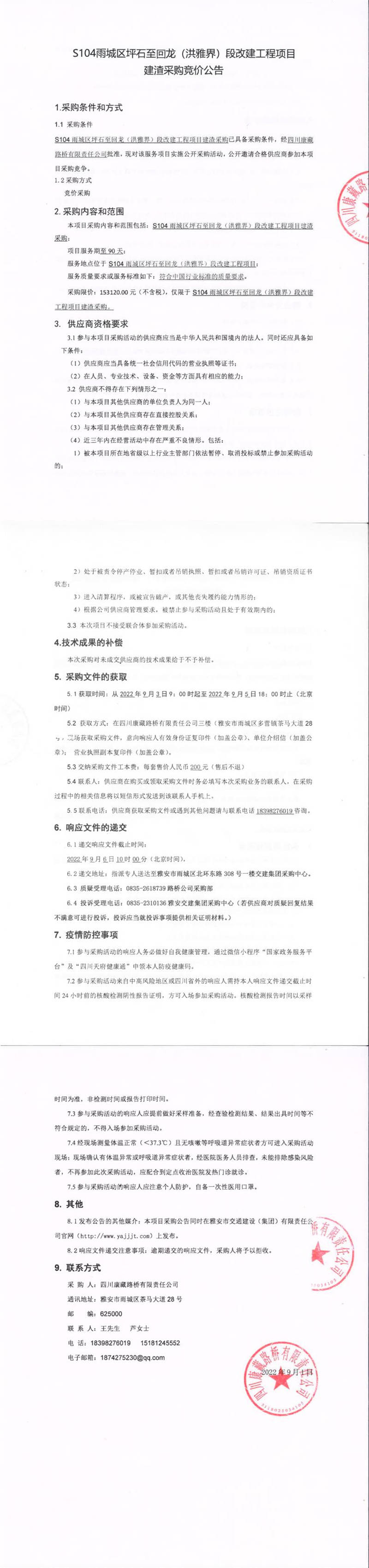 四川康藏路橋有限責(zé)任公司S104雨城區(qū)坪石至回龍(洪雅界)段改建工程項目建渣采購競價公告