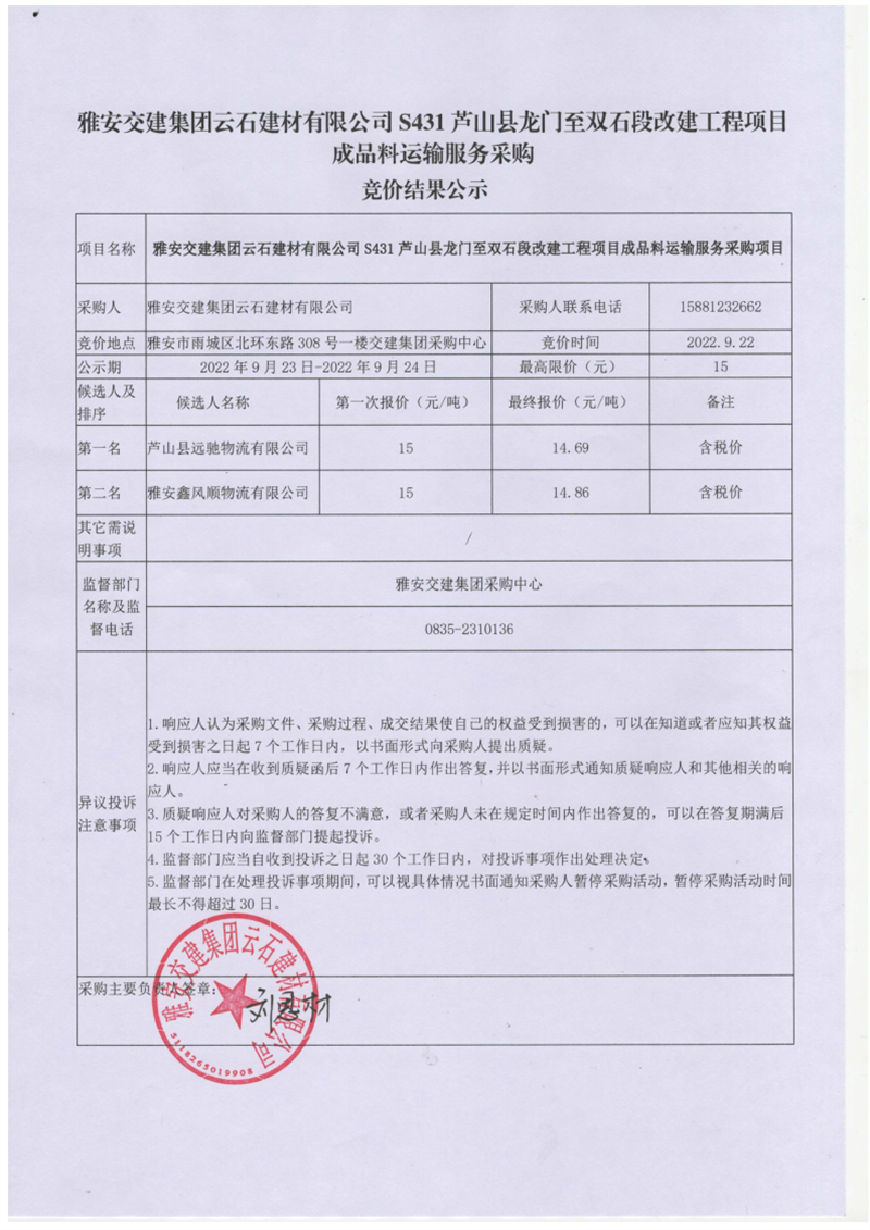 雅安交建集團云石建材有限公司S431蘆山縣龍門至雙石段改建工程項目成品料運輸服務(wù)采購競價結(jié)果公示