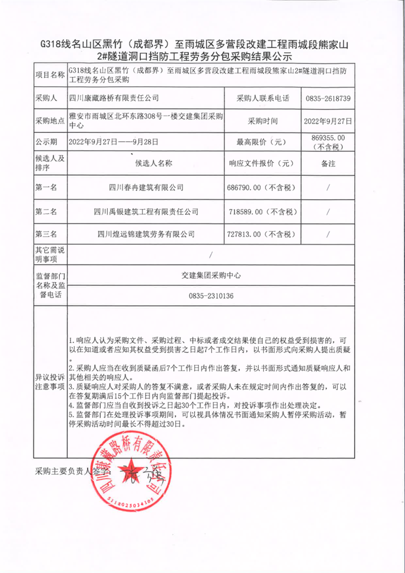 四川康藏路橋有限責(zé)任公司G318線名山區(qū)黑竹(成都界)至雨城區(qū)多營段改建工程雨城段熊家山2#隧道洞口擋防工程勞務(wù)分包采購結(jié)果公示