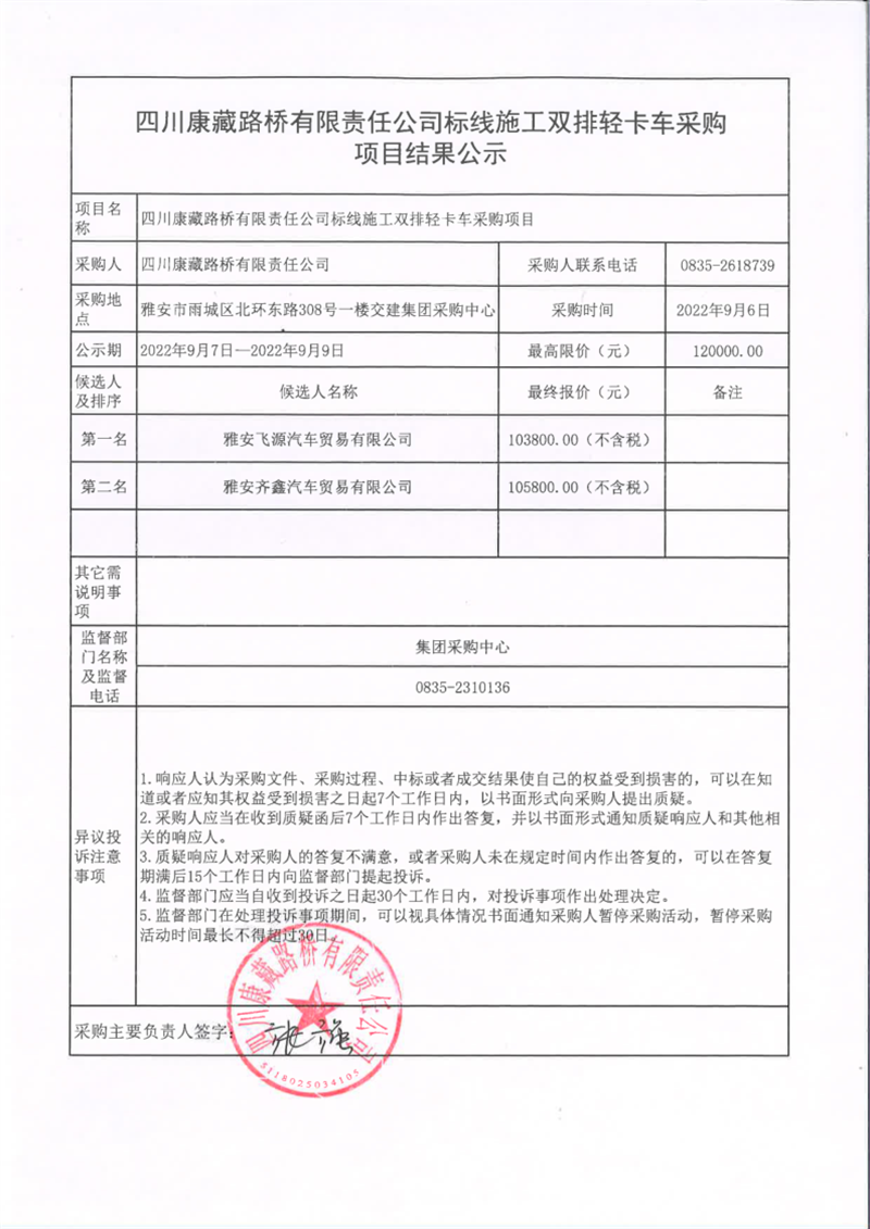 四川康藏路橋有限責(zé)任公司標(biāo)線施工雙排輕卡車采購(gòu)項(xiàng)目結(jié)果公示