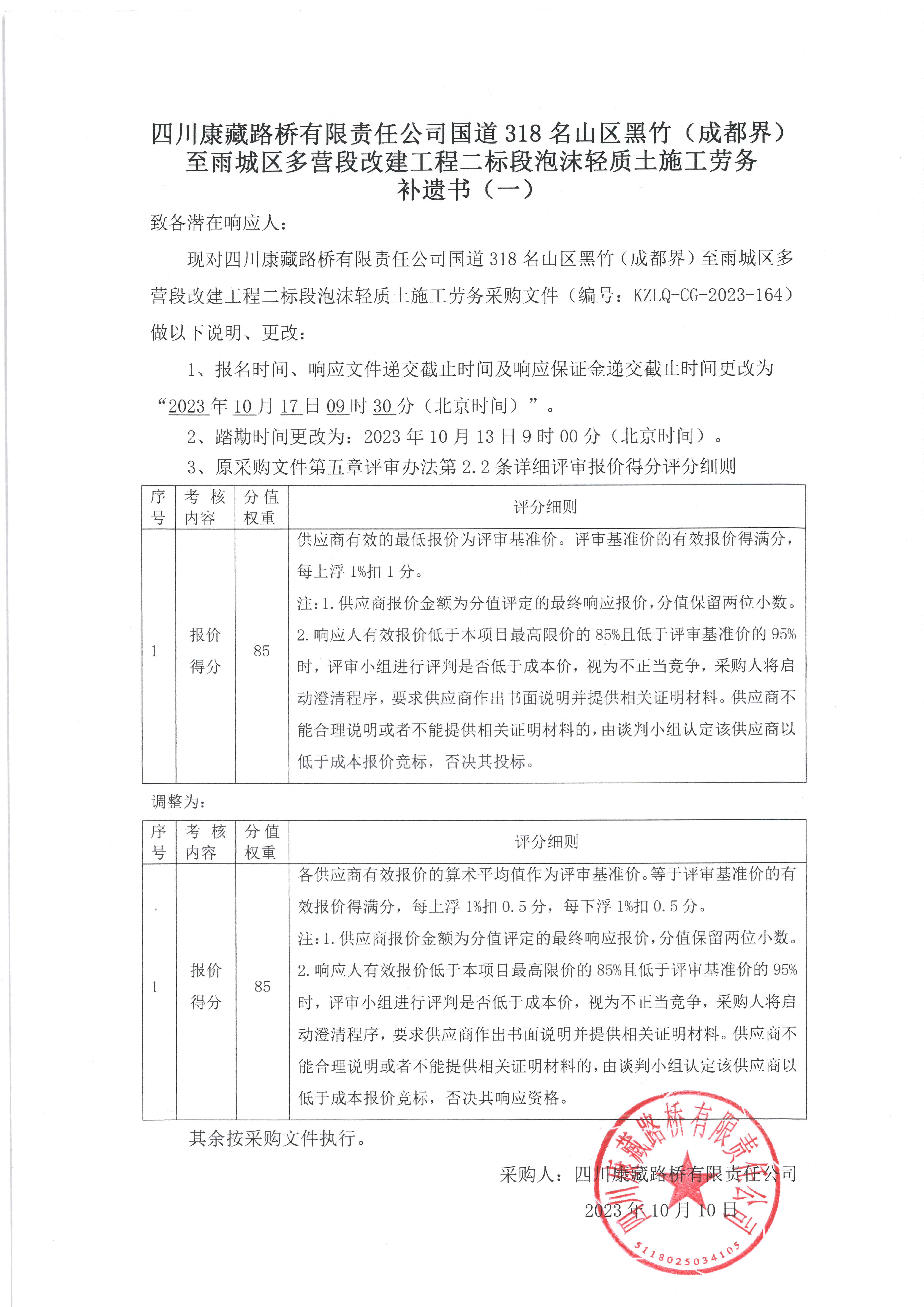 四川康藏路橋有限責(zé)任公司國道318名山區(qū)黑竹(成都界)至雨城區(qū)多營(yíng)段改建工程二標(biāo)段泡沫輕質(zhì)土施工勞務(wù)補(bǔ)遺書(一)