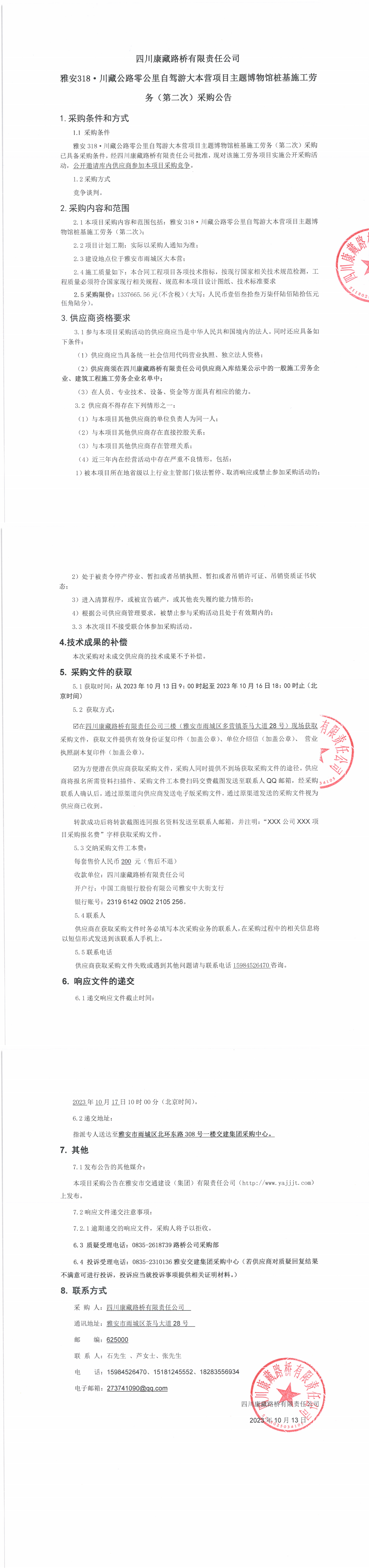 四川康藏路橋有限責(zé)任公司雅安318·川藏公路零公里自駕游大本營(yíng)項(xiàng)目主題博物館樁基施工勞務(wù)(第二次)采購(gòu)公告