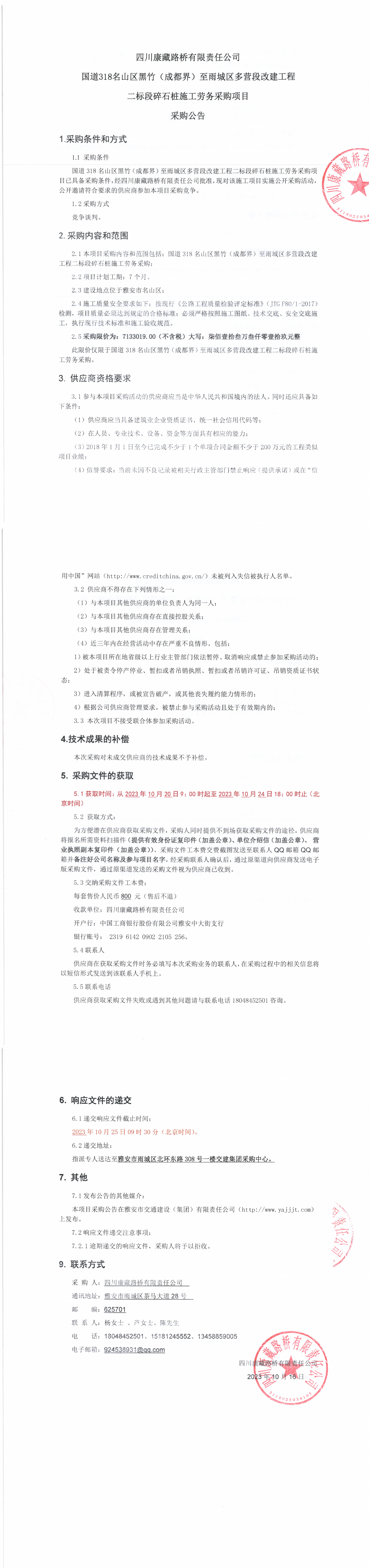 四川康藏路橋有限責(zé)任公司國道318名山區(qū)黑竹(成都界)至雨城區(qū)多營段改建工程二標段碎石樁施工勞務(wù)采購項目采購公告