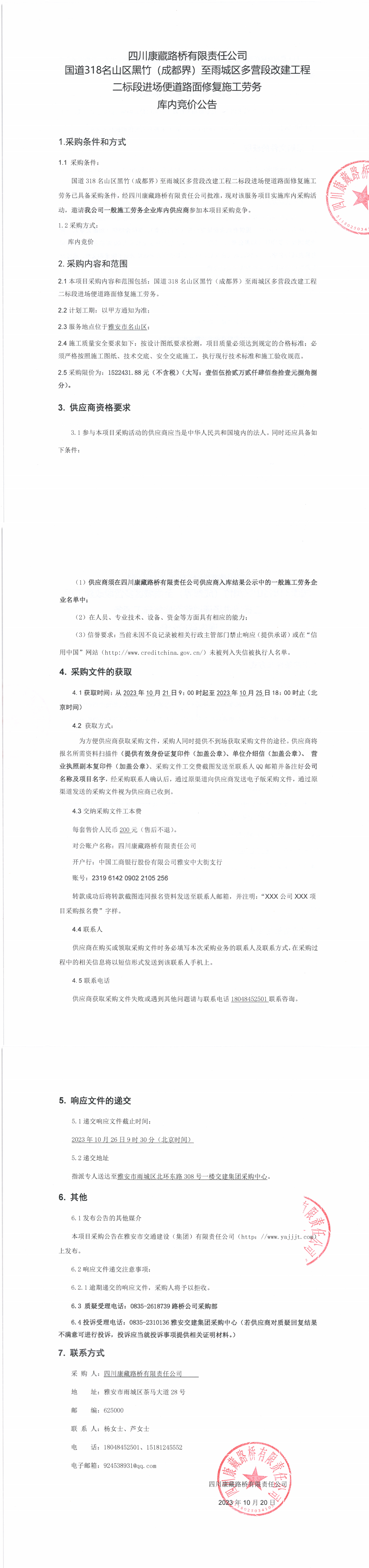 四川康藏路橋有限責(zé)任公司國(guó)道318名山區(qū)黑竹(成都界)至雨城區(qū)多營(yíng)段改建工程二標(biāo)段進(jìn)場(chǎng)便道路面修復(fù)施工勞務(wù)庫(kù)內(nèi)競(jìng)價(jià)公告