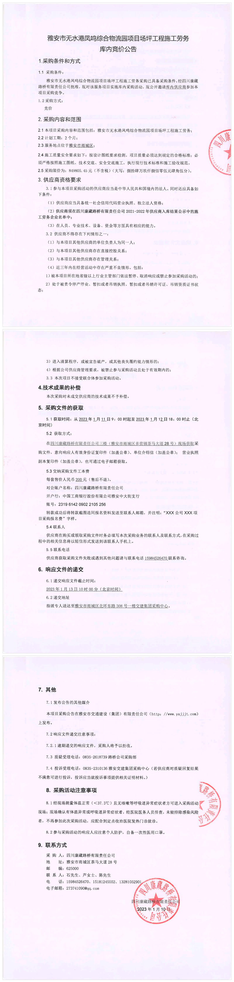 四川康藏路橋有限責(zé)任公司雅安市無水港鳳鳴綜合物流園項(xiàng)目場坪工程施工勞務(wù)庫內(nèi)競價公告