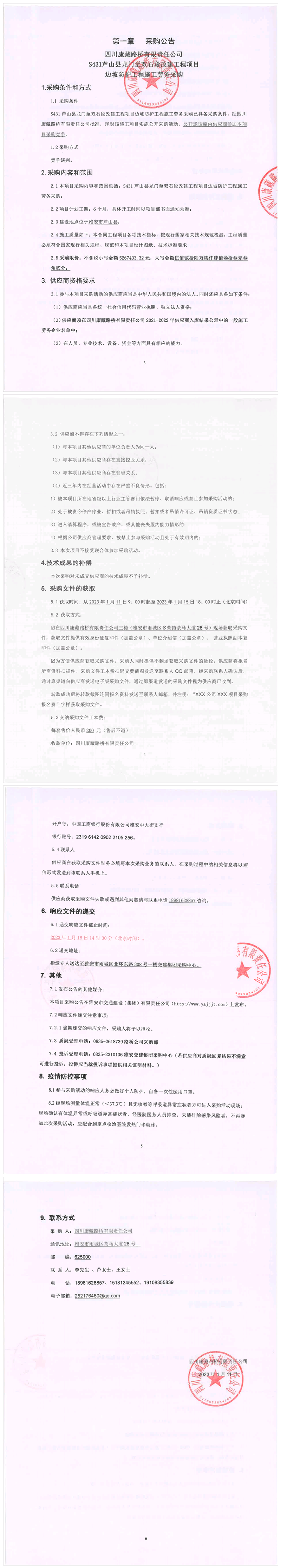 四川康藏路橋有限責(zé)任公司S431蘆山縣龍門至雙石段改建工程項目邊坡防護(hù)工程施工勞務(wù)采購公告