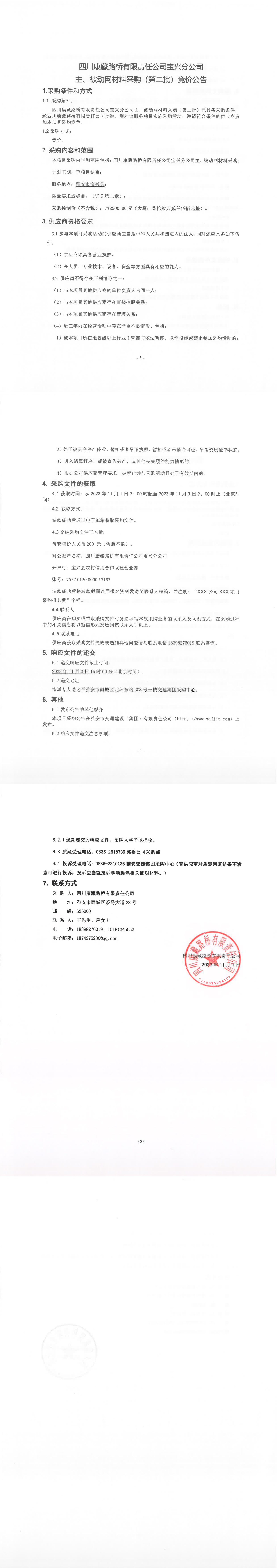 四川康藏路橋有限責任公司寶興分公司主、被動網(wǎng)材料采購(第二批)競價公告