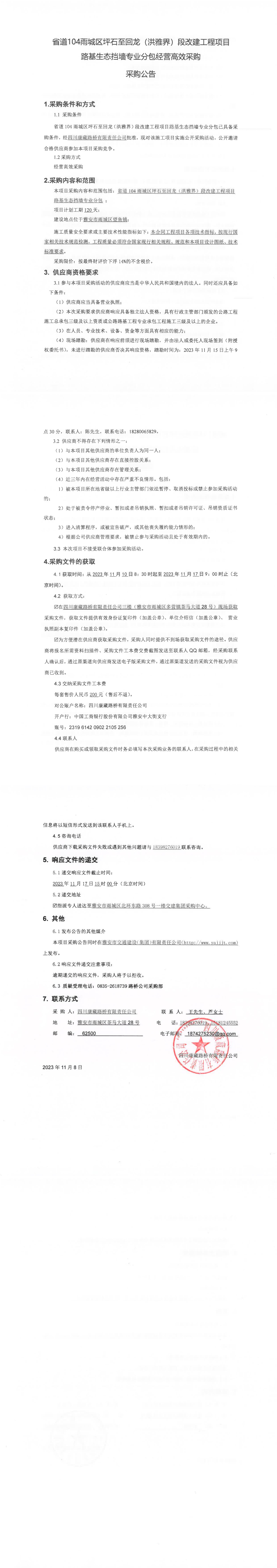 四川康藏路橋有限責(zé)任公司省道104雨城區(qū)坪石至回龍(洪雅界)段改建工程項目路基生態(tài)擋墻專業(yè)分包經(jīng)營高效采購公告