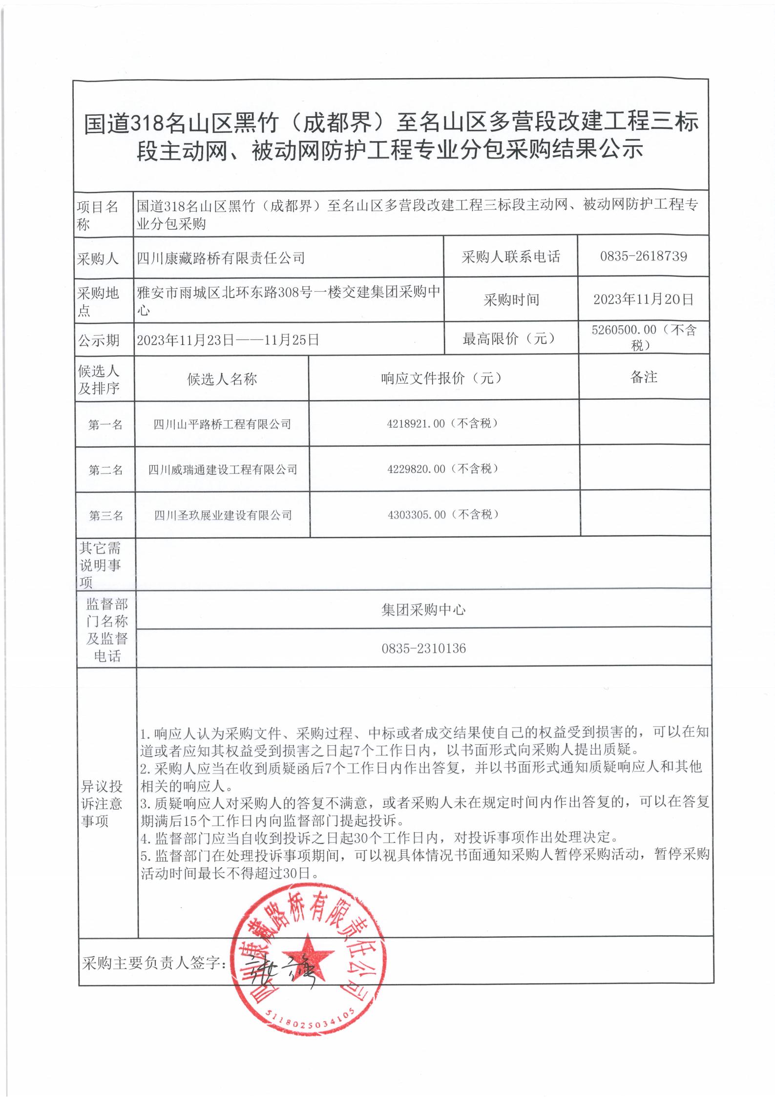 四川康藏路橋有限責(zé)任公司國道318名山區(qū)黑竹(成都界)至名山區(qū)多營段改建工程三標(biāo)段主動(dòng)網(wǎng)、被動(dòng)網(wǎng)防護(hù)工程專業(yè)分包采購結(jié)果公示