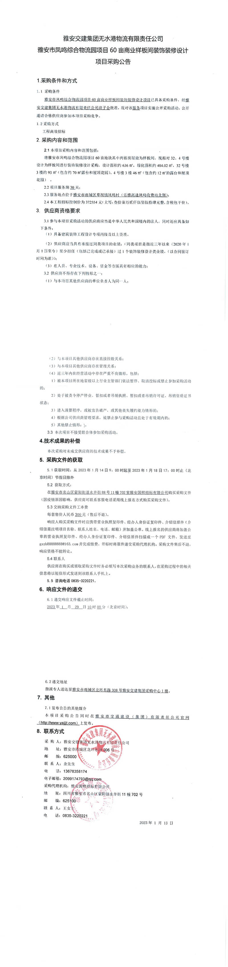 雅安交建集團(tuán)無(wú)水港物流有限責(zé)任公司雅安市鳳鳴綜合物流園項(xiàng)目60畝商業(yè)樣板間裝飾裝修設(shè)計(jì)項(xiàng)目采購(gòu)公告