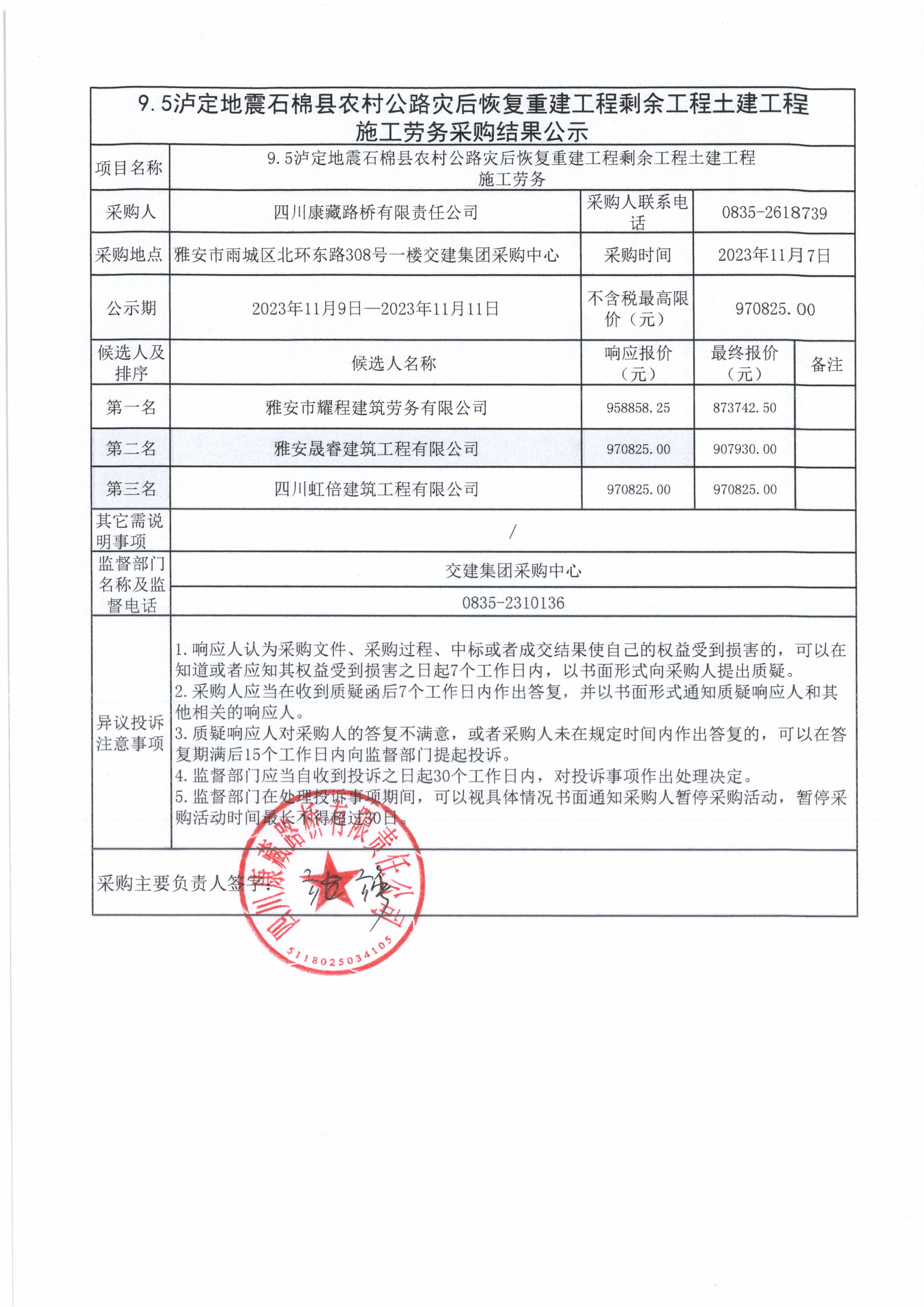 四川康藏路橋有限責任公司9.5瀘定地震石棉縣農(nóng)村公路災后恢復重建工程剩余工程土建工程施工勞務采購結(jié)果公示