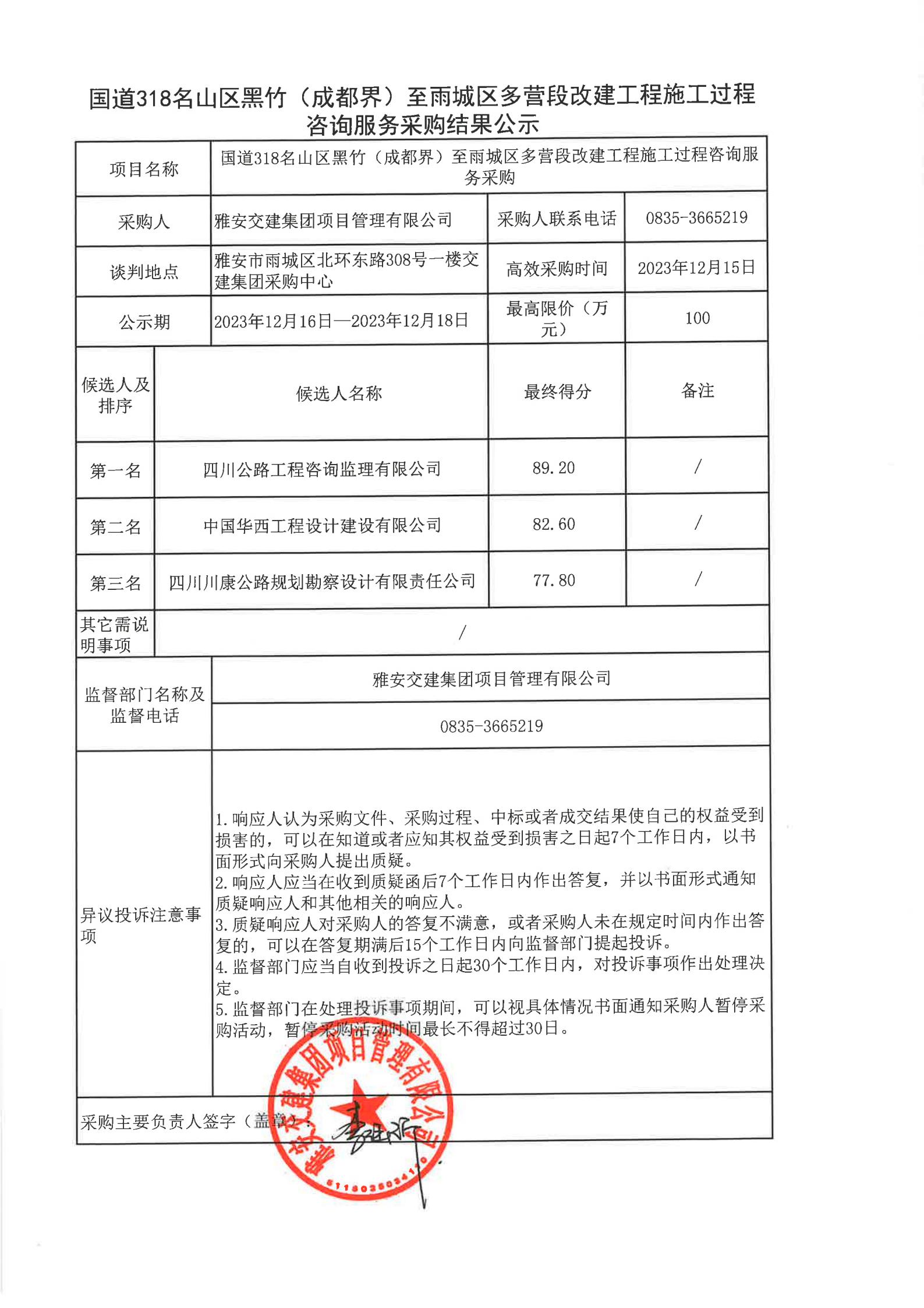 雅安交建集團(tuán)項(xiàng)目管理有限公司國(guó)道318名山區(qū)黑竹(成都界)至雨城區(qū)多營(yíng)段改建工程施工過(guò)程咨詢服務(wù)采購(gòu)結(jié)果公示