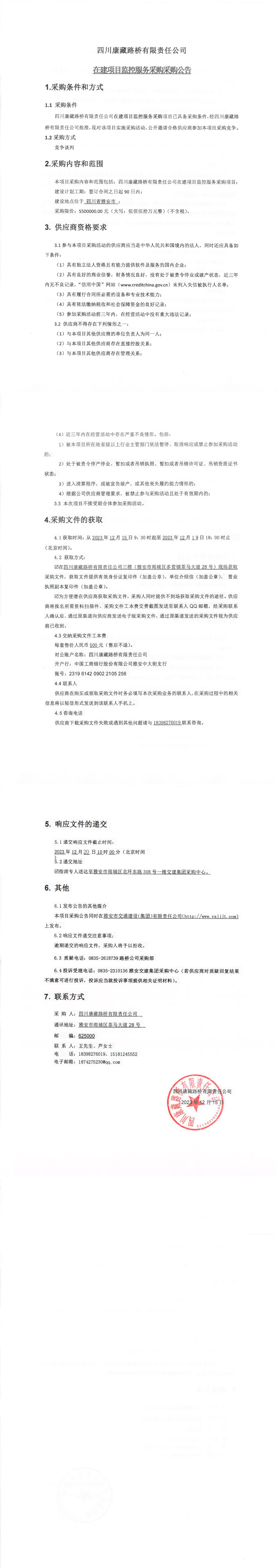 四川康藏路橋有限責(zé)任公司在建項目監(jiān)控服務(wù)采購公告