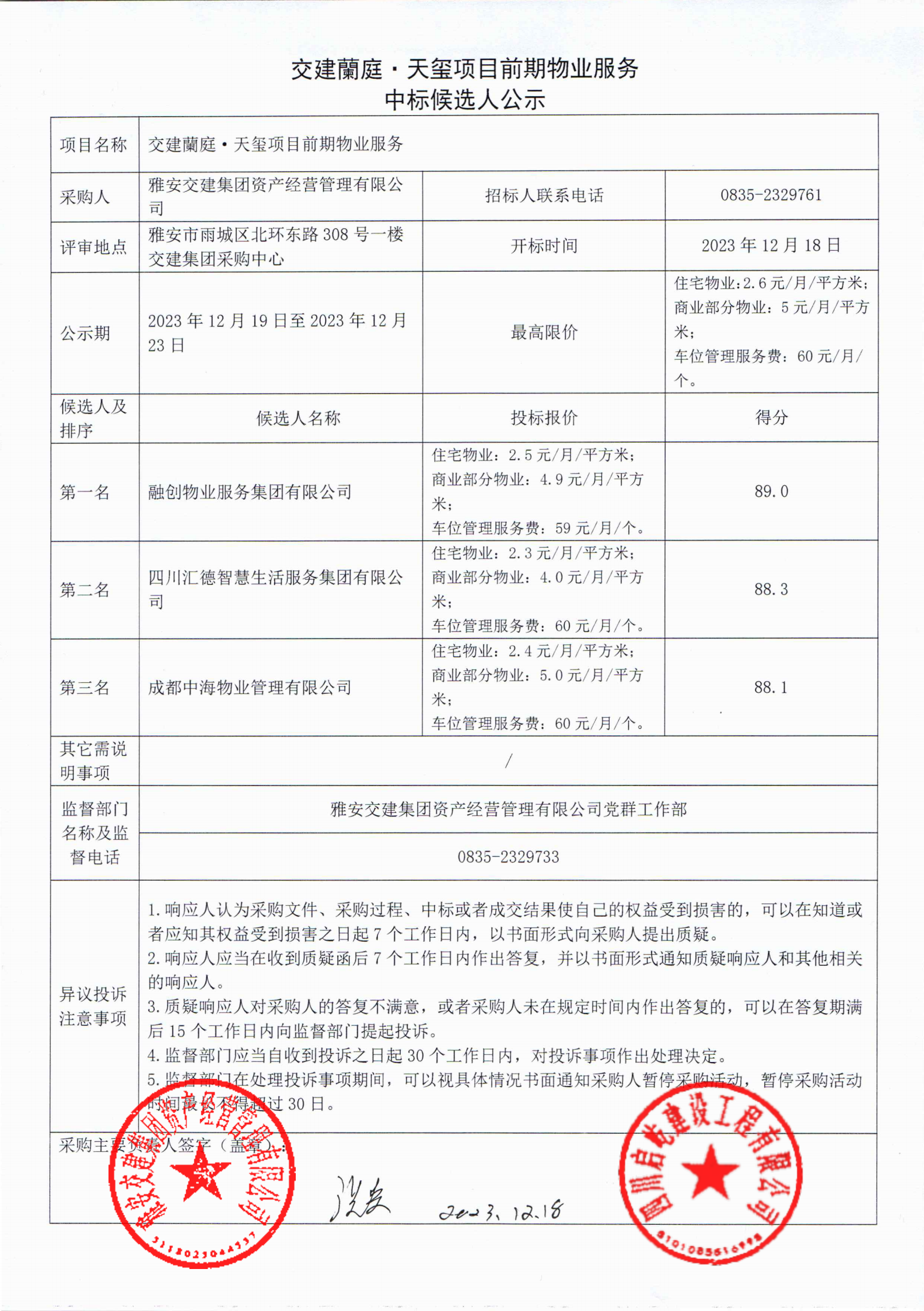 雅安交建集團(tuán)資產(chǎn)經(jīng)營管理有限公司交建蘭庭·天璽項(xiàng)目前期物業(yè)服務(wù)中標(biāo)候選人公示