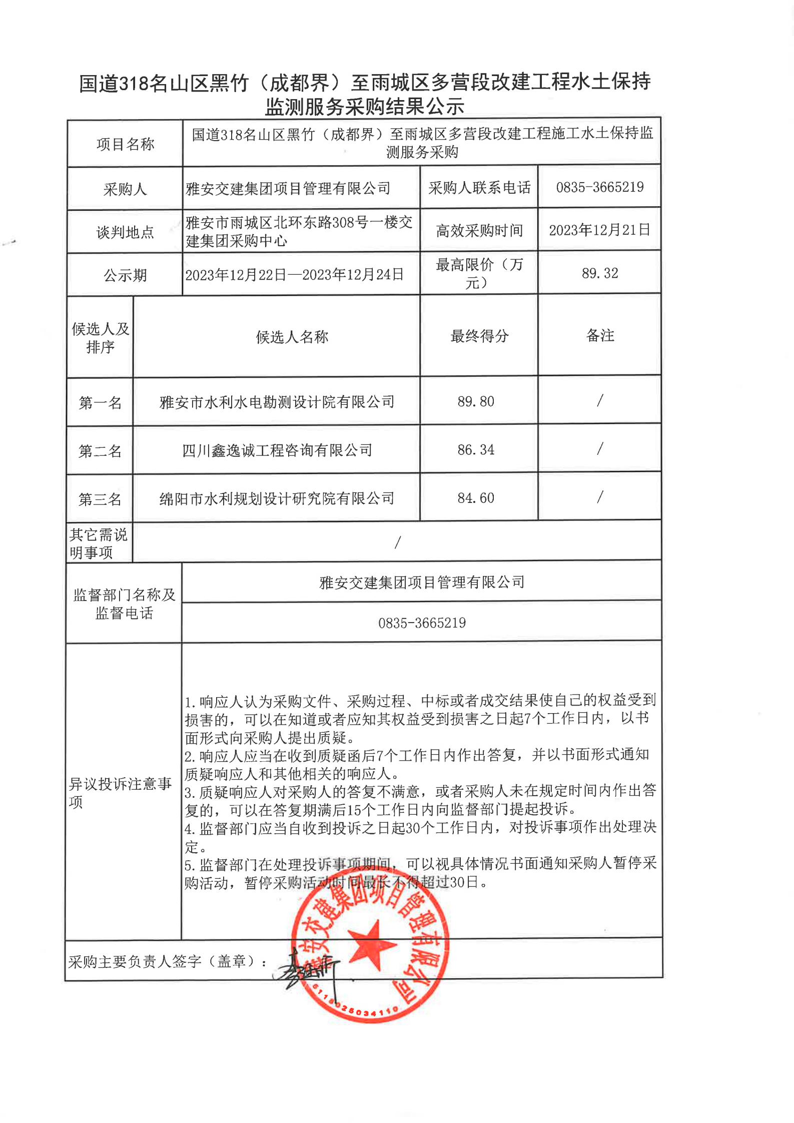 雅安交建集團(tuán)項(xiàng)目管理有限公司國(guó)道318名山區(qū)黑竹(成都界)至雨城區(qū)多營(yíng)段改建工程水土保持監(jiān)測(cè)服務(wù)采購(gòu)結(jié)果公示