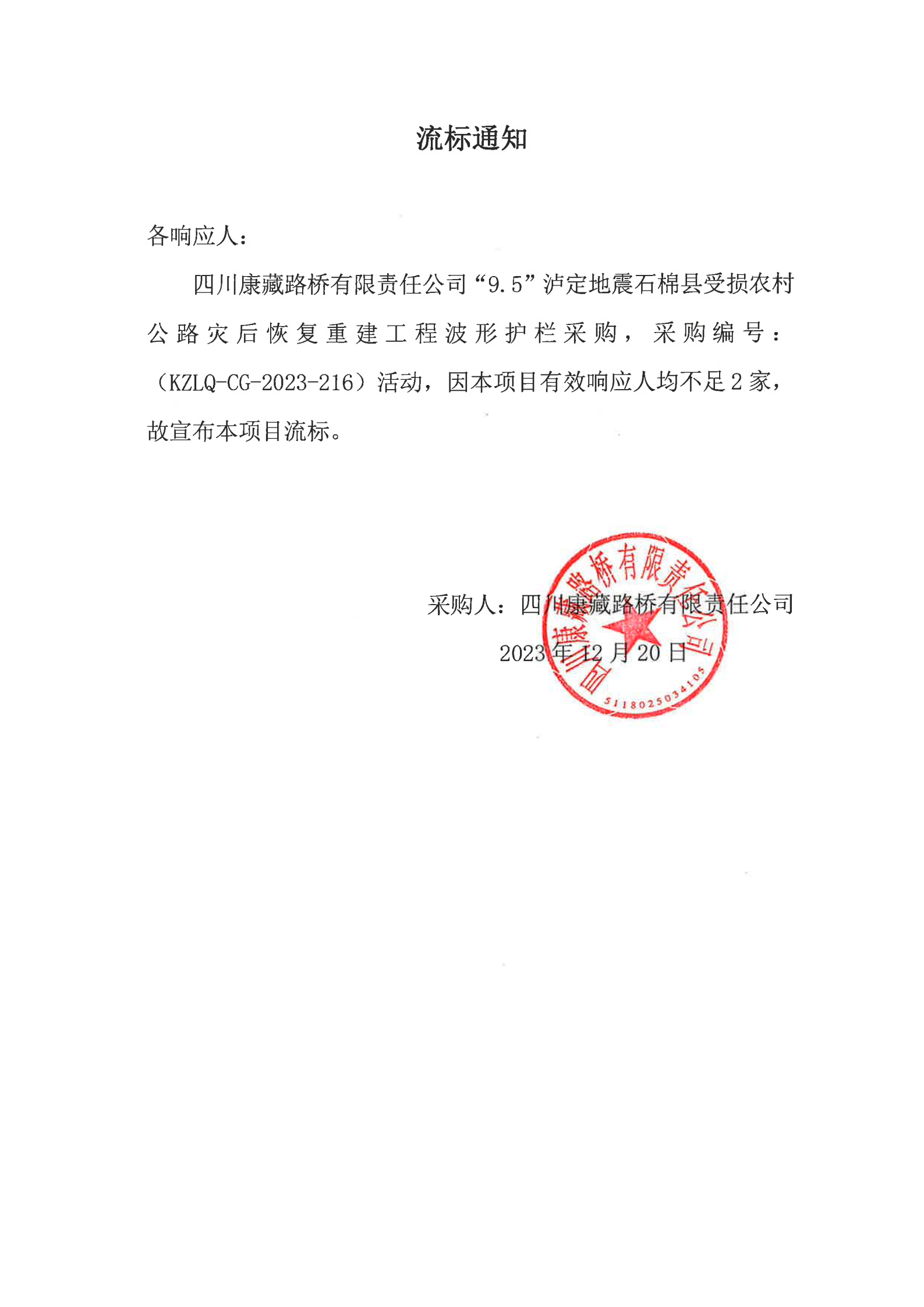 四川康藏路橋有限責(zé)任公司“9.5”瀘定地震石棉縣受損農(nóng)村公路災(zāi)后恢復(fù)重建工程波形護欄采購流標(biāo)通知