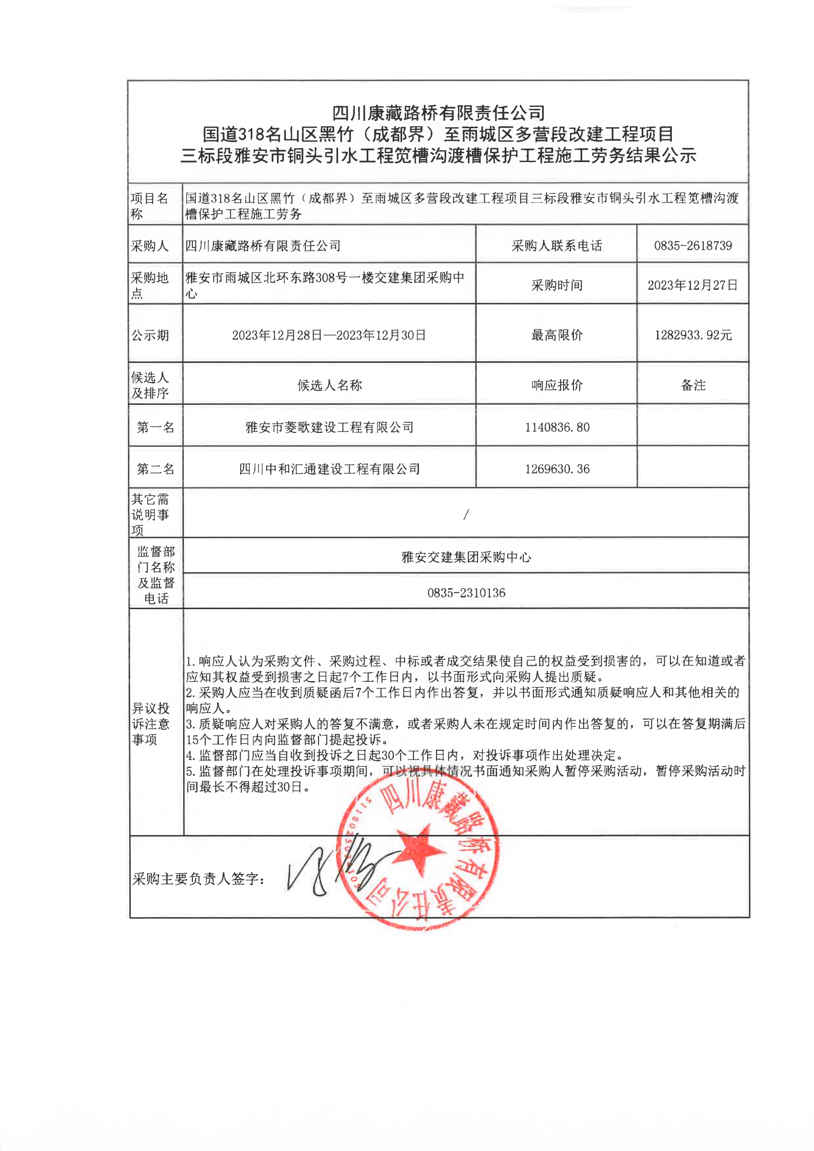 四川康藏路橋有限責任公司國道318名山區(qū)黑竹(成都界)至雨城區(qū)多營段改建工程項目三標段雅安市銅頭引水工程筧槽溝渡槽保護工程施工勞務結(jié)果公示