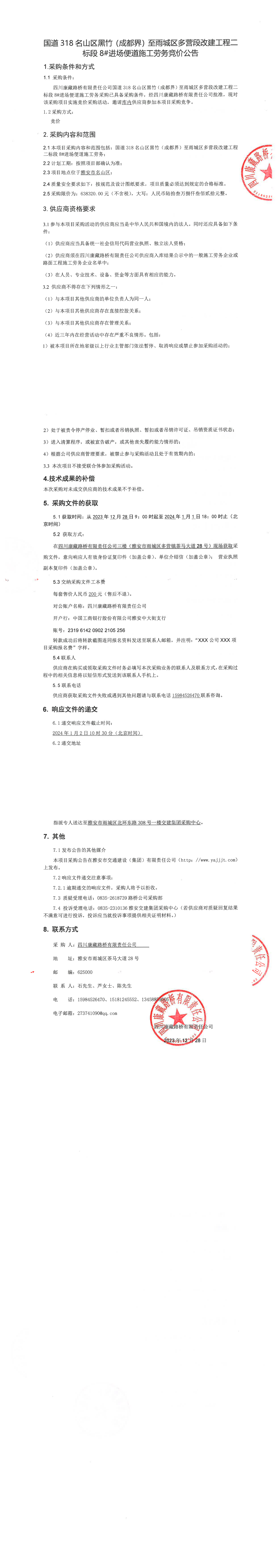 四川康藏路橋有限責(zé)任公司國道318名山區(qū)黑竹(成都界)至雨城區(qū)多營段改建工程二標(biāo)段8#進(jìn)場便道施工勞務(wù)競價(jià)公告