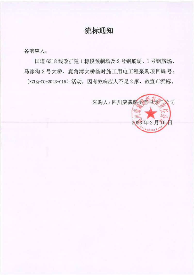 四川康藏路橋有限責(zé)任公司國(guó)道G318線改擴(kuò)建1標(biāo)段預(yù)制場(chǎng)及2號(hào)鋼筋場(chǎng)、1號(hào)鋼筋場(chǎng)、馬家溝2號(hào)大橋、鹿角灣大橋臨時(shí)施工用電工程采購(gòu)項(xiàng)目流標(biāo)通知