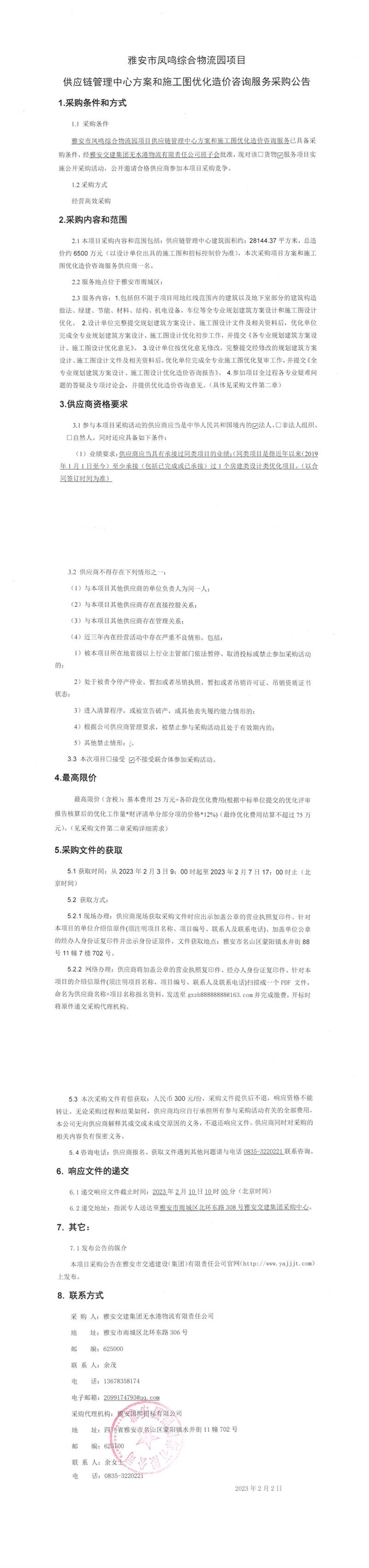 雅安交建集團無水港物流有限責任公司雅安市鳳鳴綜合物流園項目供應鏈管理中心方案和施工圖優(yōu)化造價咨詢服務采購公告