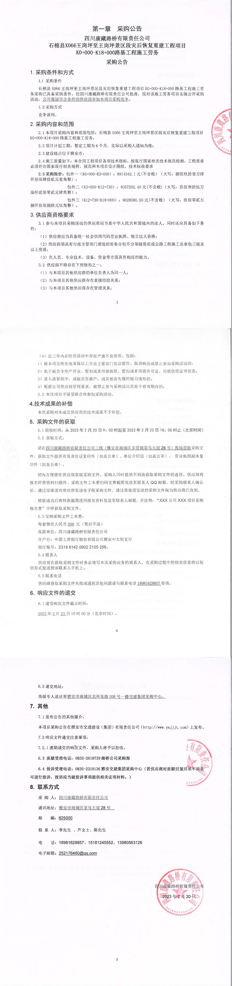 四川康藏路橋有限責(zé)任公司石棉縣X066王崗坪至王崗坪景區(qū)段災(zāi)后恢復(fù)重建工程項目K0+000-K18+000路基工程施工勞務(wù)采購公告