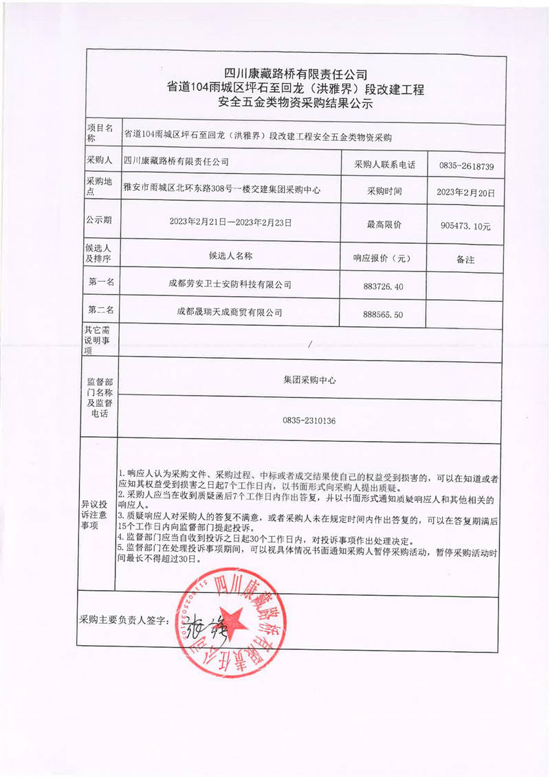 四川康藏路橋有限責(zé)任公司省道104雨城區(qū)坪石至回龍(洪雅界)段改建工程安全五金類物資采購(gòu)結(jié)果公示
