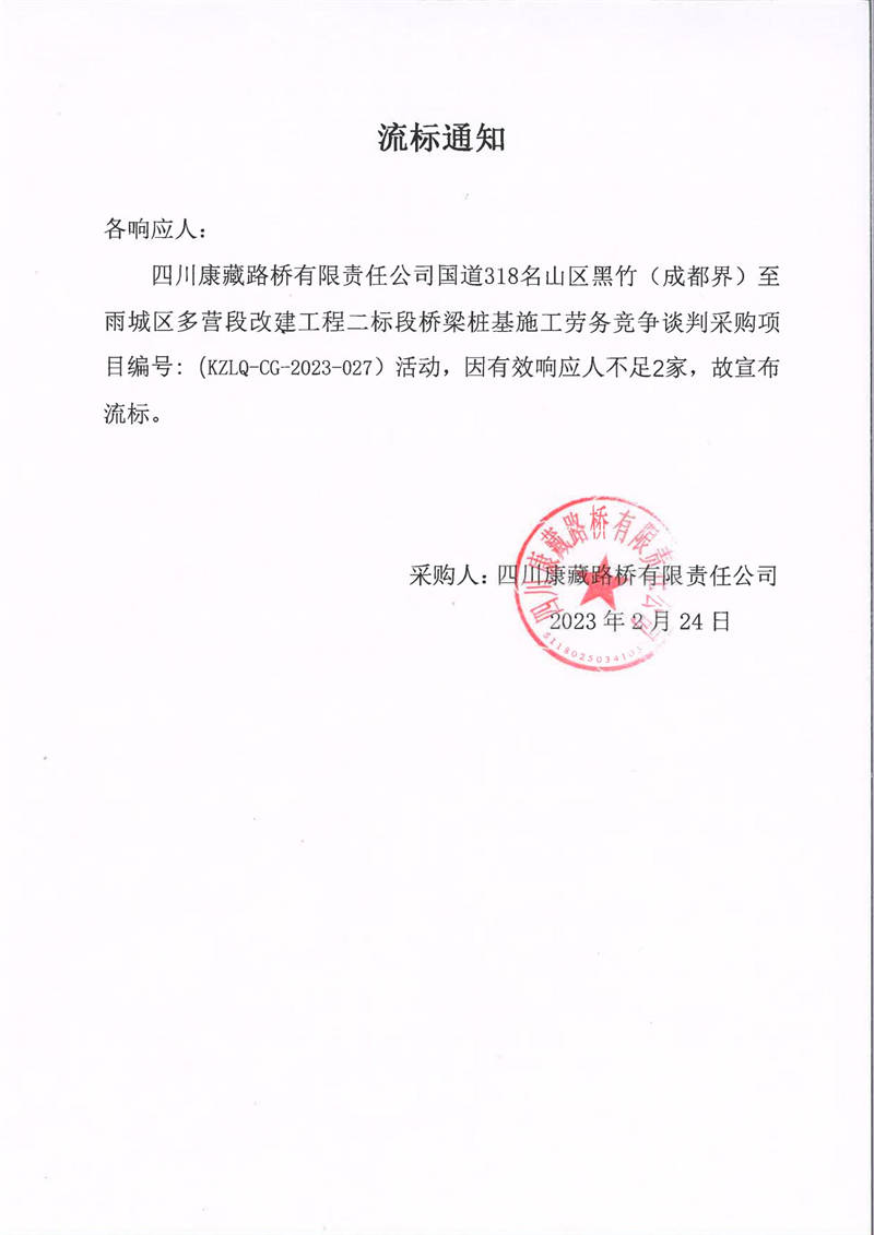 四川康藏路橋有限責任公司國道318名山區(qū)黑竹(成都界)至雨城區(qū)多營段改建工程二標段橋梁樁基施工勞務競爭談判采購流標通知