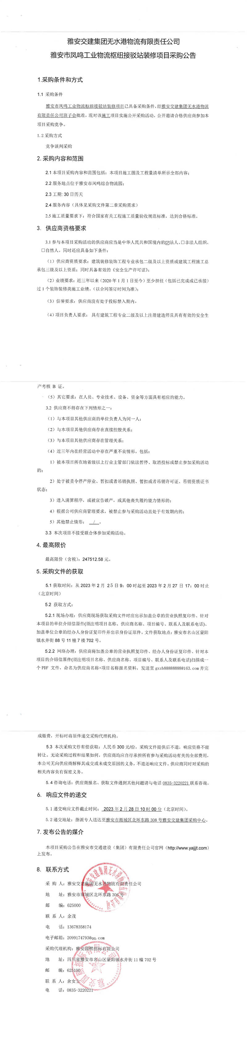 雅安交建集團(tuán)無水港物流有限責(zé)任公司雅安市鳳鳴工業(yè)物流樞紐接駁站裝修項(xiàng)目采購公告