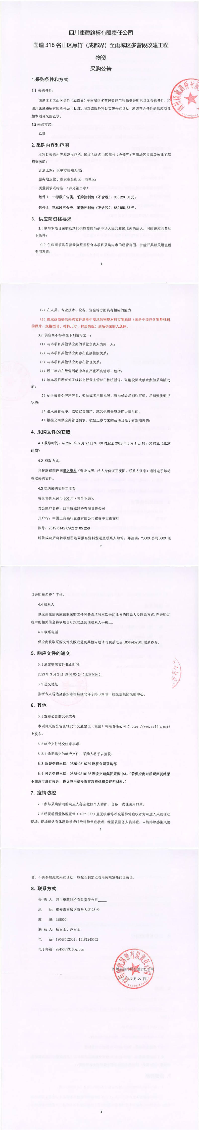 四川康藏路橋有限責任公司國道318名山區(qū)黑竹(成都界)至雨城區(qū)多營段改建工程物資采購公告