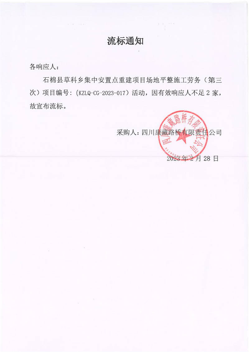 四川康藏路橋有限責任公司石棉草科鄉(xiāng)集中安置點重建項目場地平整施工勞務(第三次)庫內(nèi)競價流標通知