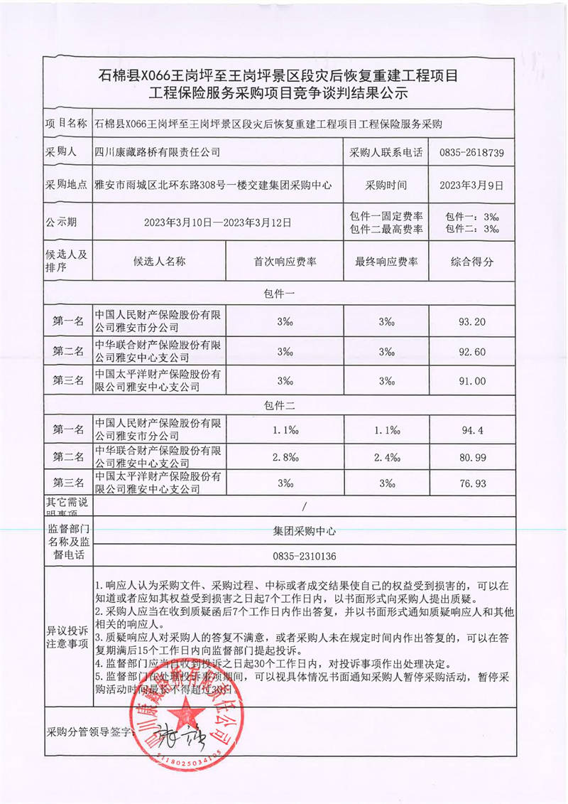 四川康藏路橋有限責(zé)任公司石棉縣X066王崗坪至王崗坪景區(qū)段災(zāi)后恢復(fù)重建工程項(xiàng)目工程保險(xiǎn)服務(wù)采購競爭談判結(jié)果公示
